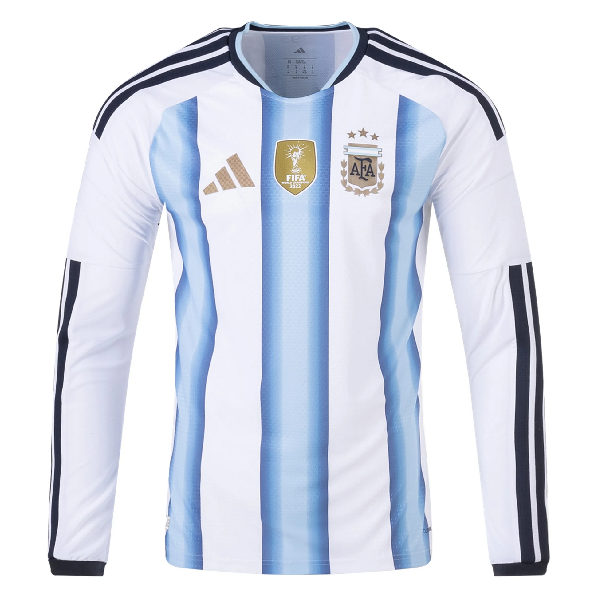 Celebrate Argentina's three World Cup victories in one iconic jersey. This 26/27 home kit features a gradient of sky blue shades from 1978, 1986, and 2022—each representing a championship won. The traditional stripes blend these historic hues into a striking visual tribute to la Albiceleste's legacy. Complete with a seasonal collar, flat-knit cuffs, and "1893" embroidered at the back neck honoring the federation's founding, this is more than a jersey—it's a monument to champions.