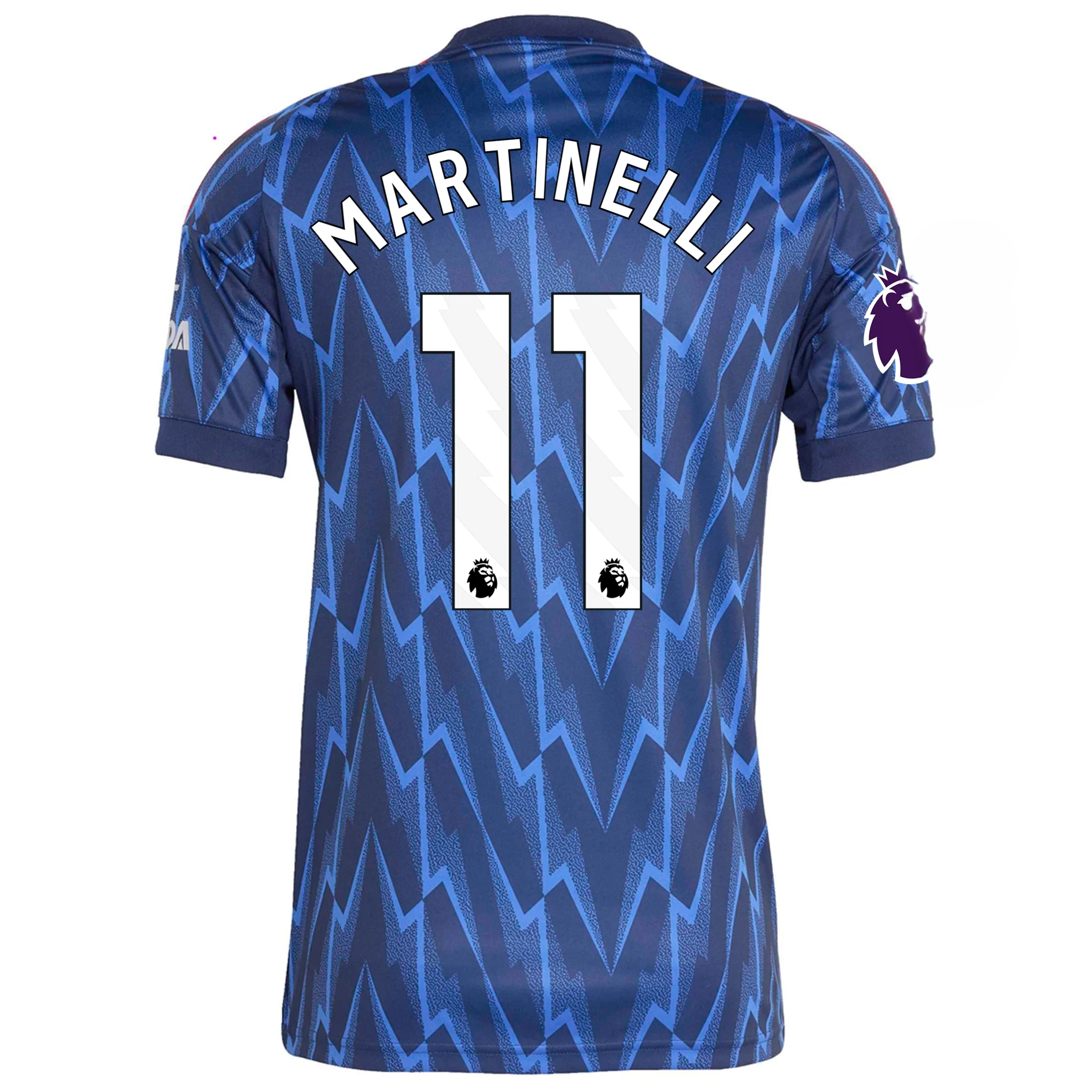 Secure the Arsenal Away Jersey for the 2025/2026 season, with the name and number of the Gunners' electric winger, Gabriel Martinelli #11. This season's Away Kit is a modern reimagining of a fan favorite, featuring a striking Night Indigo blue base color and an all-over, light-blue lightning bolt graphic.