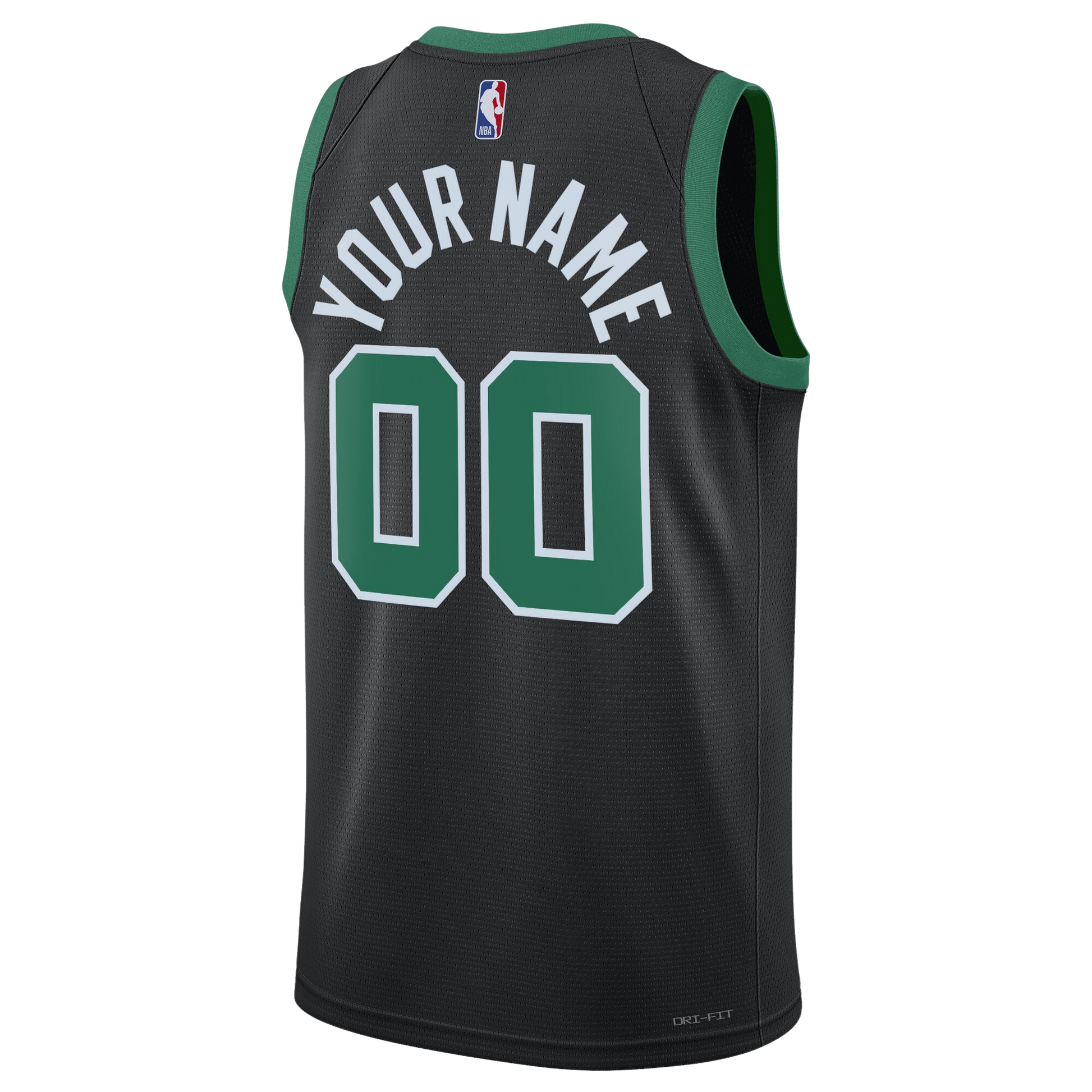 Crafted in commanding Black, signifying elite status. Your chosen name and number will be applied in the signature Green and White trim, often featuring a sleek, modern font treatment that makes your custom identity pop with fearless energy. The all-black base with the vibrant Celtics colors creates an unforgettable, intense look.
