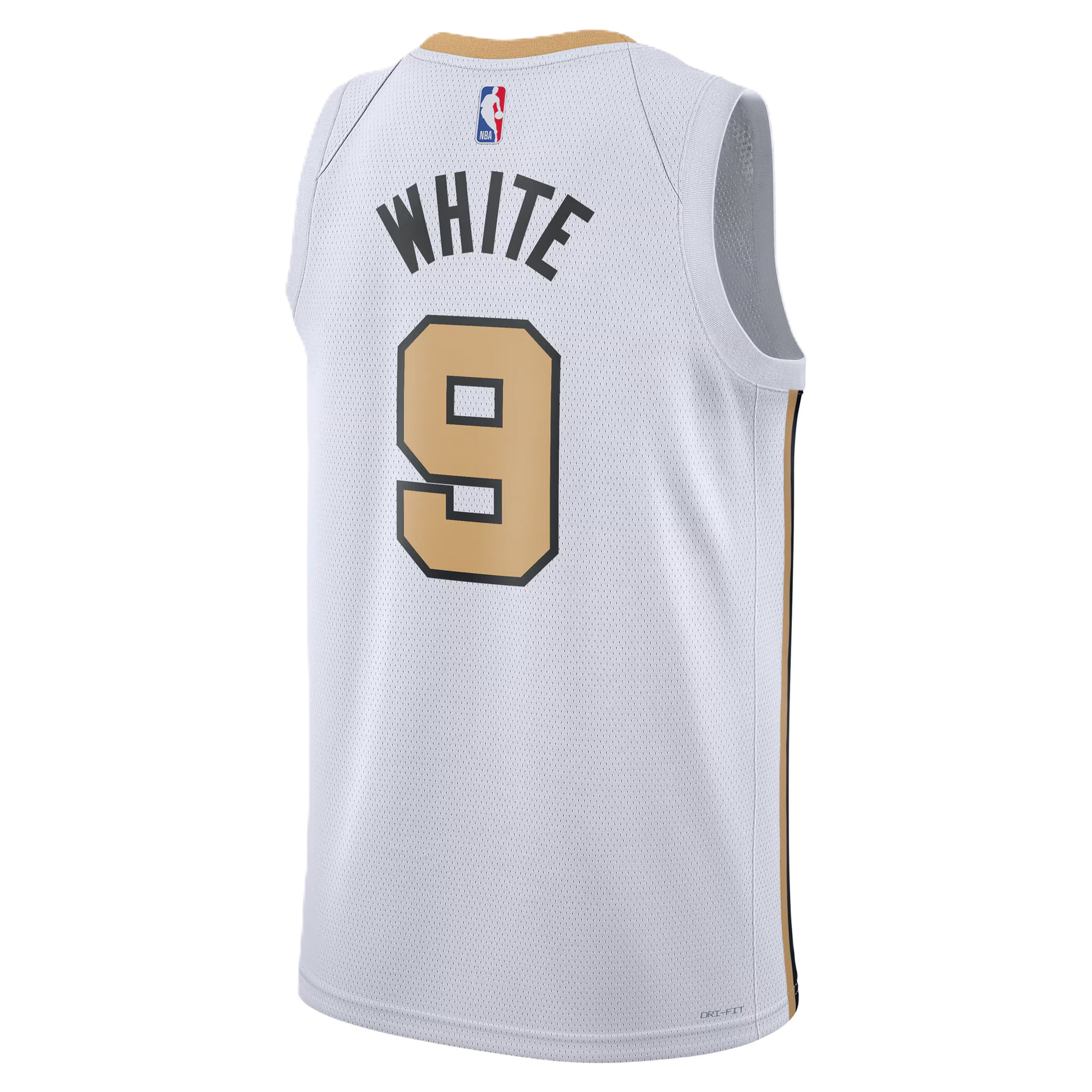 Boston Celtics White 2025-2026 City Edition Jersey featuring Derrick White #9. Crisp white fabric meets championship gold and black styling for a bold look. Metallic gold lettering pops against the clean base, complemented by gold and black trim along the collar and sides. Coach Red Auerbach's embroidered signature above the jock tag pays tribute to the franchise's storied winning tradition.