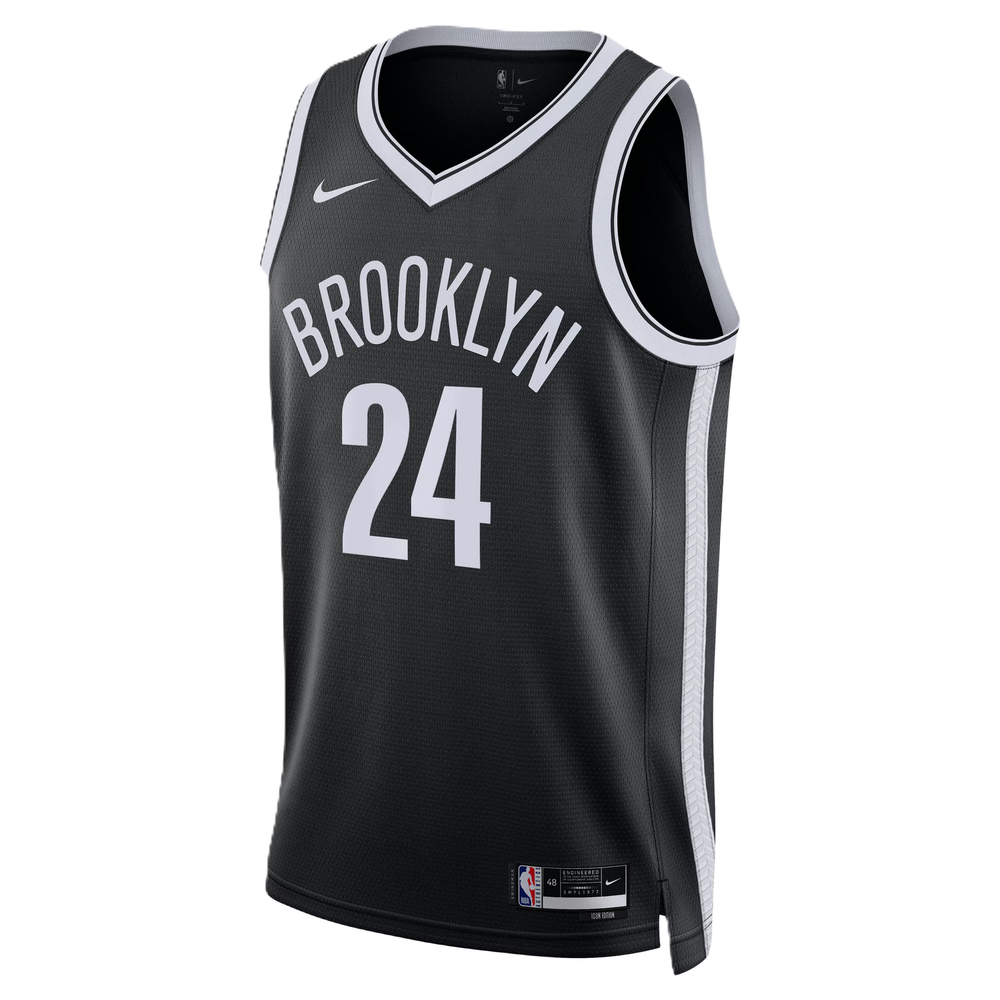 Saturated in the primary Black color, this Icon uniform proudly displays the arched "BROOKLYN" wordmark across the chest and Cam Thomas’ #24 in stark, clean White lettering. The high-contrast design is pure, sophisticated, and instantly recognizable. The clean, classic trim ensures the focus remains on the bold identity and the player wearing it.