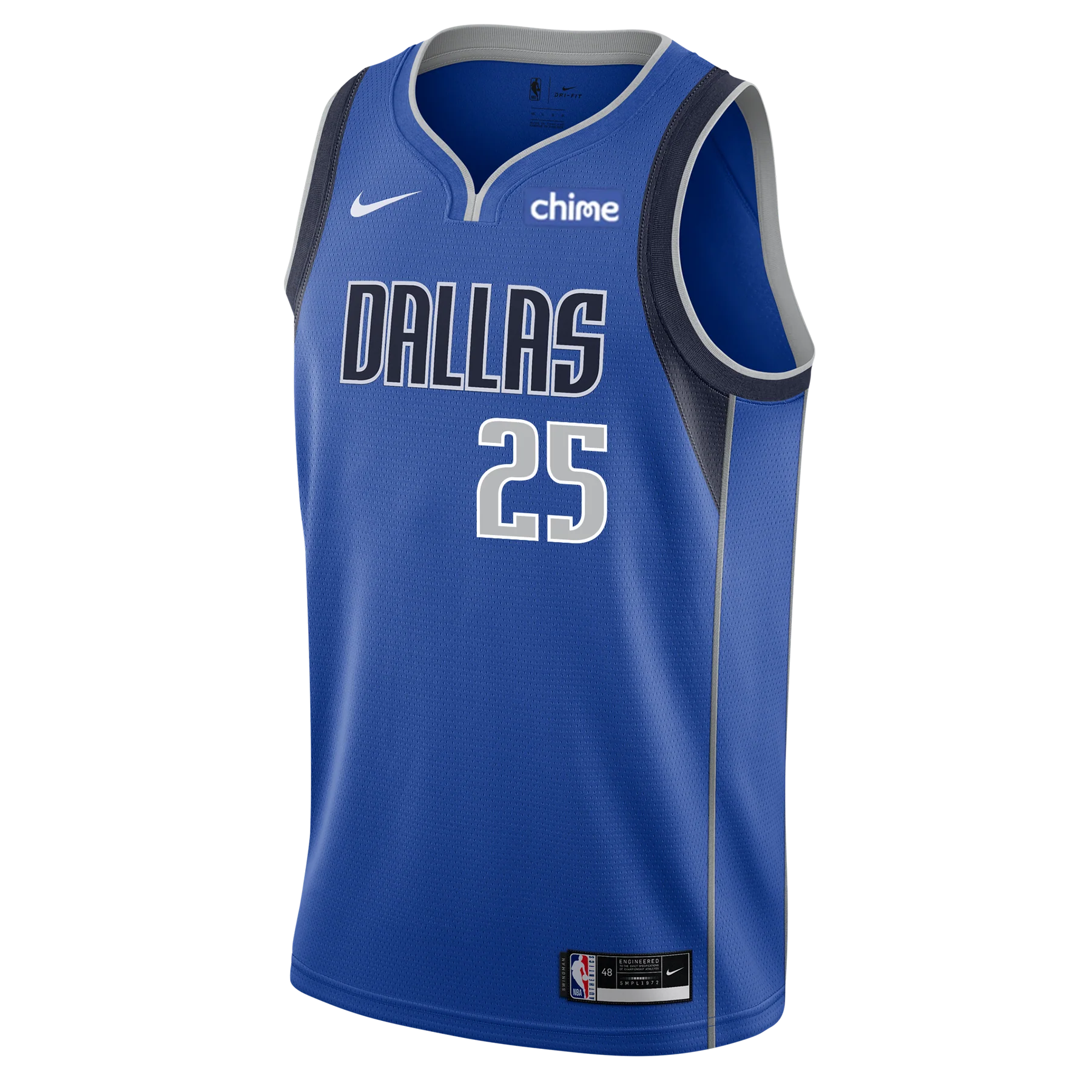 The wordmark "DALLAS" is displayed across the chest in Navy Blue with a sharp White outline, creating a clean contrast against the bright blue fabric. Washington Jr.'s number 25 is below the wordmark in Silver/Gray with a White outline, maintaining a classic and bold look.