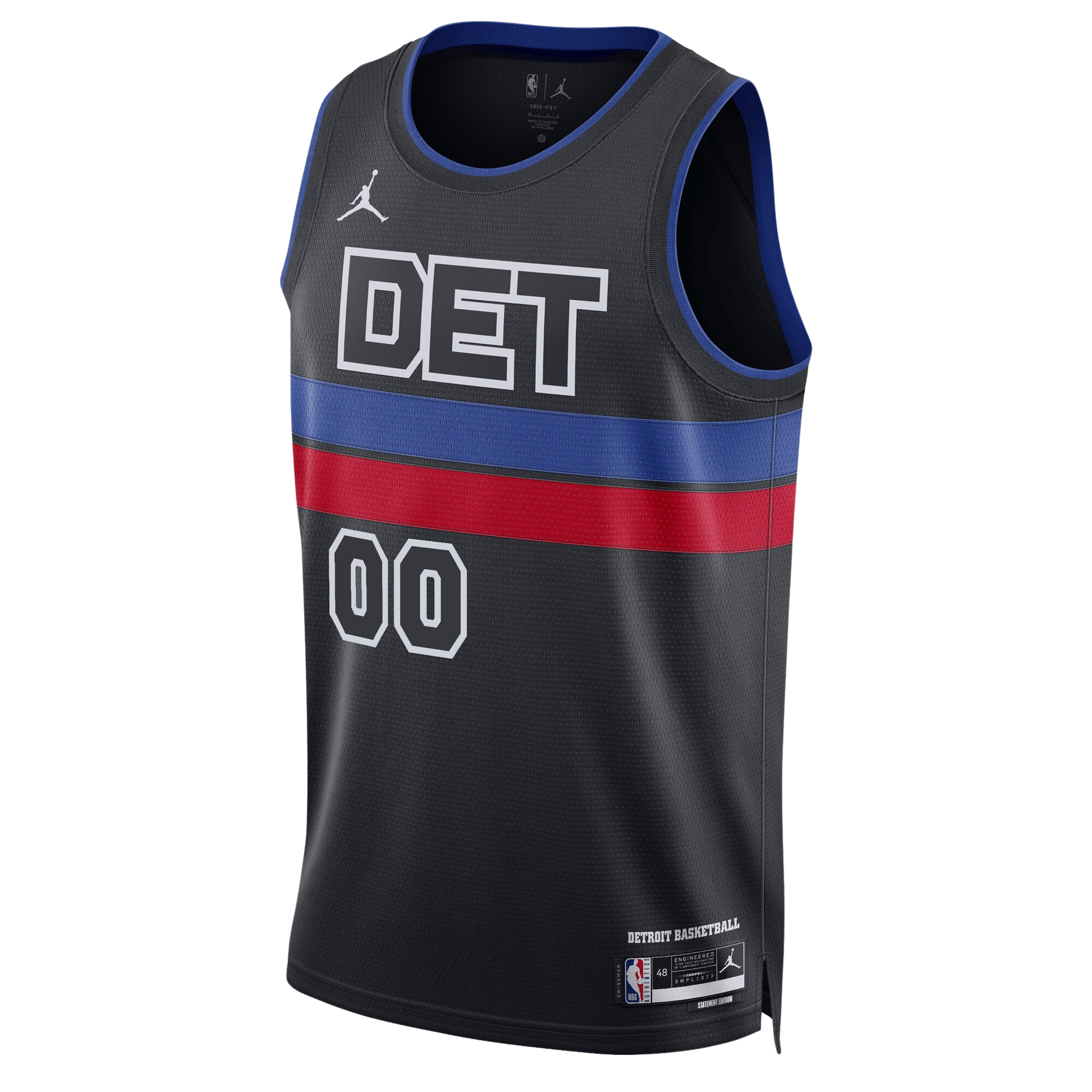 Dominate in this sleek Detroit Pistons Black Statement Jersey. The chest showcases "DET" in White sandwiched between bold Red and Blue horizontal stripes. Personalize the back with your name and number in crisp White. Energetic side stripe detailing amplifies the modern, aggressive aesthetic that defines Pistons pride.