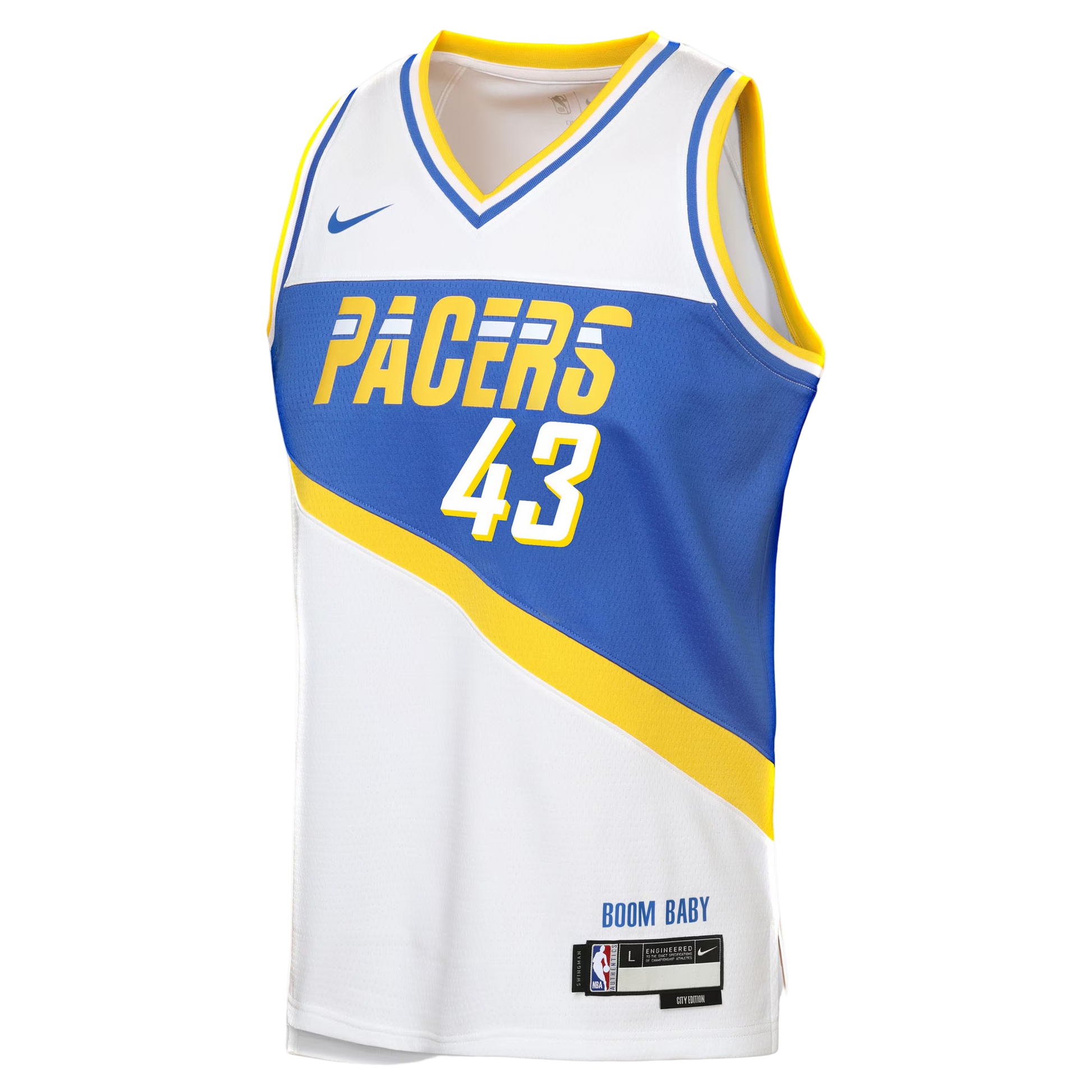 Sport the boldest Pacers statement of the season. This White City Edition Jersey fuses Indiana's racing legacy with iconic 90s style, featuring a striking Royal Blue diagonal stripe and Gold accents. The classic "PACERS" chest lettering channels the legendary 1984-1990 era, while "Boom Baby!" honors Hall of Famer Bobby Leonard. Pascal Siakam #43 in a design that demands attention.