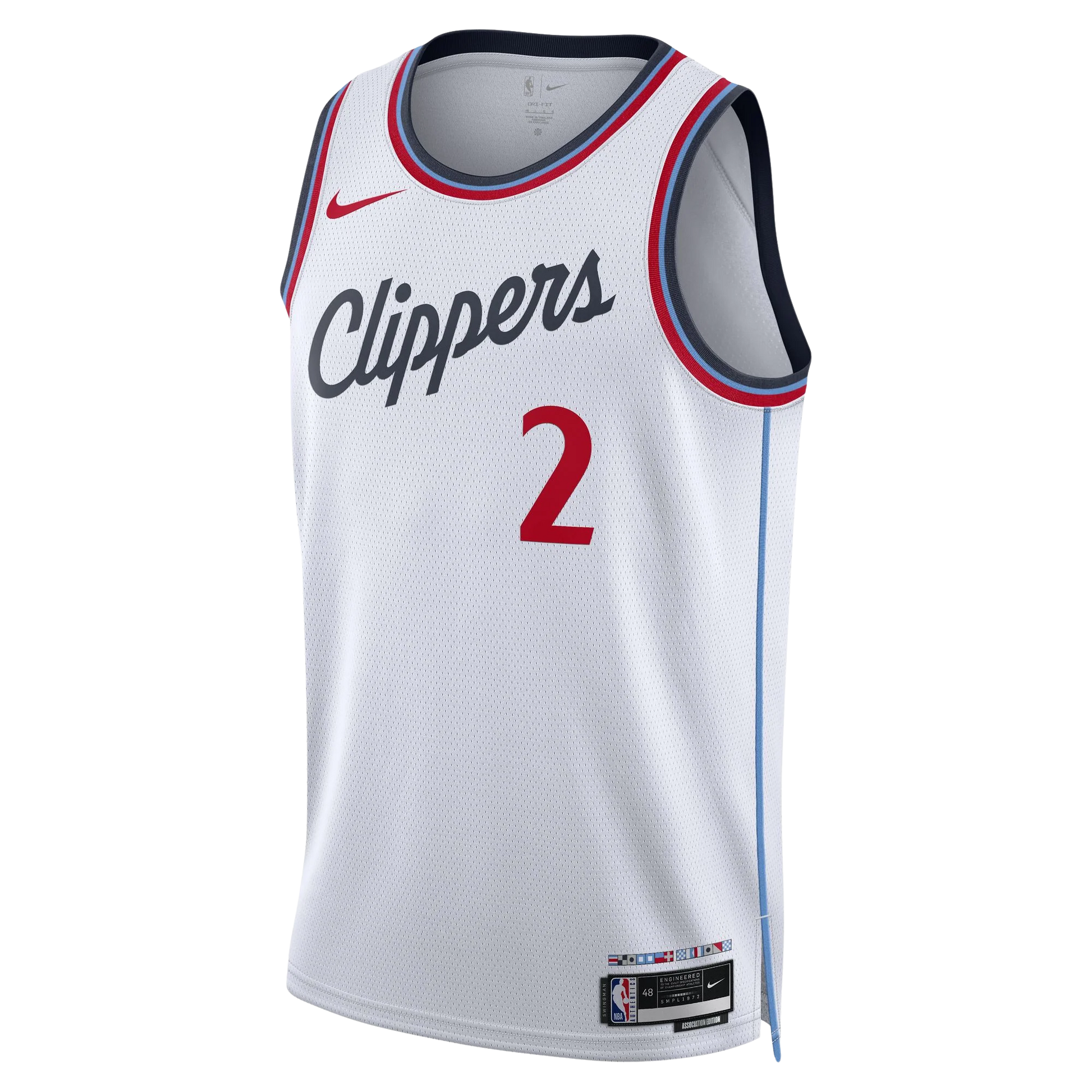 The LA Clippers White Association Jersey for Kawhi Leonard #2 offers a sharp, bold look with clean "CLIPPERS" lettering and a sleek Pacific Blue stripe symbolizing ocean speed. This jersey captures the professional spirit of the game, letting you support Kawhi with a crisp, timeless design that stands out on and off the court.