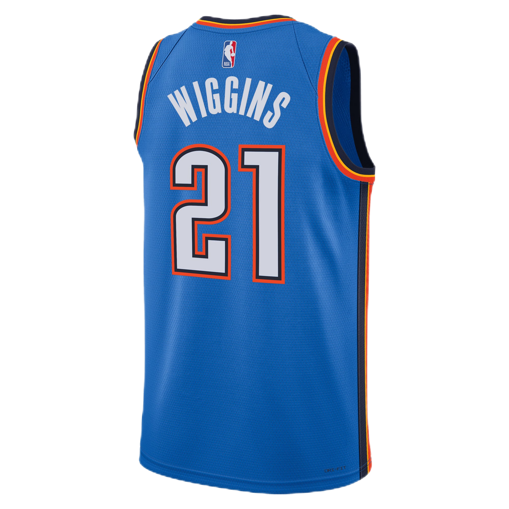 Cloaked in the classic Navy Blue, this jersey proudly features the team name, "Thunder," splashed across the chest in bold lettering with bright orange and white accents. The distinct navy color is a nod to the Oklahoma skies, uniting player and city. This is your chance to own the definitive colorway of the franchise, celebrating Wiggins' vital role in the Thunder's exciting future.