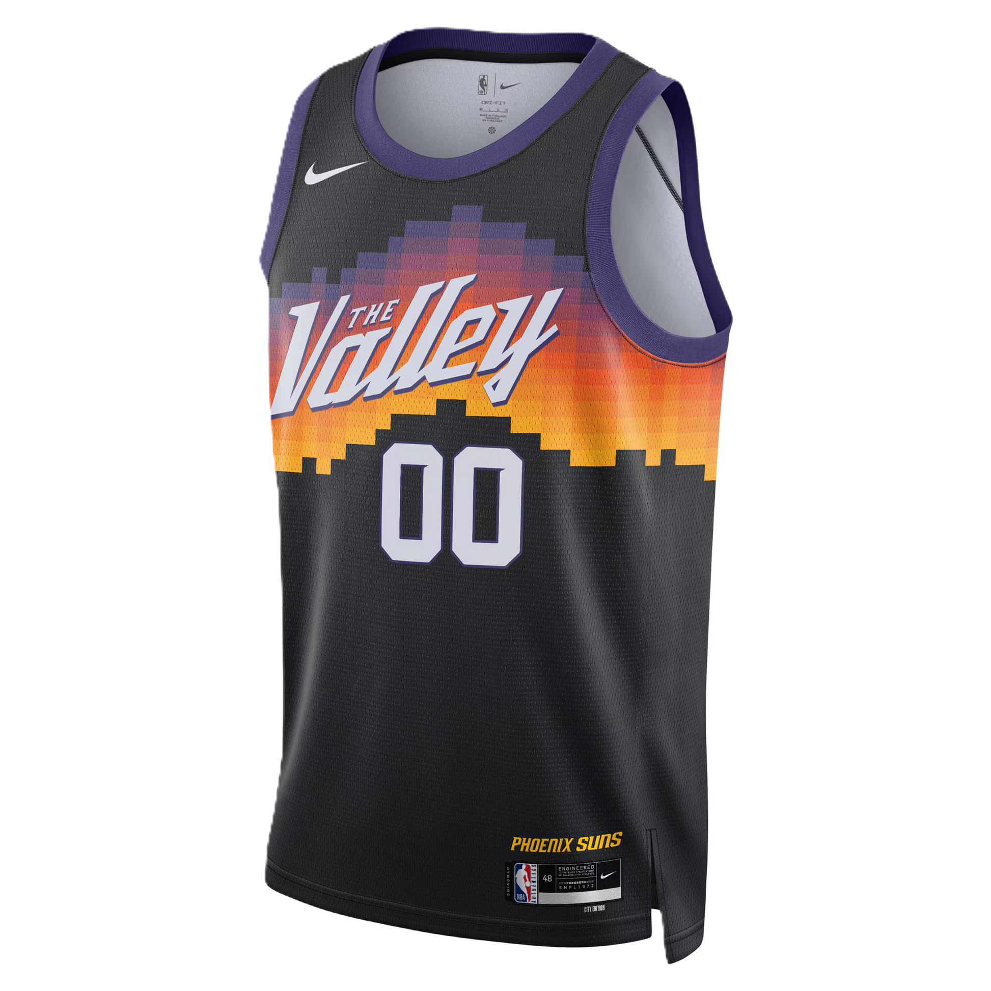 Wear the Phoenix Suns' striking 2025-2026 City Edition Jersey. The jet-black design showcases "The Valley" wordmark and a vibrant pixelated gradient stripe in orange, yellow, and purple that mirrors the Arizona desert sky. Matching sunset trim on the collar and armholes adds authentic Southwestern flair. Show your Suns pride with this bold, fan-favorite design.