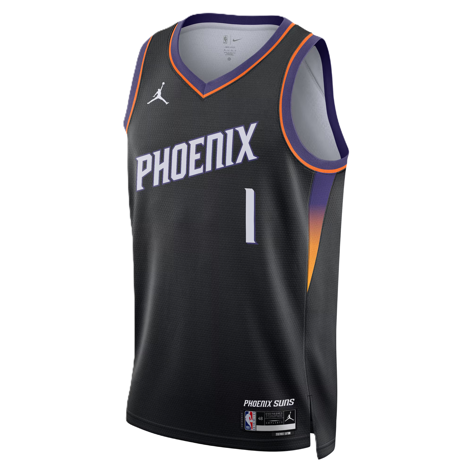Command attention in black with this bold Statement Jersey. White "PHOENIX" lettering and Booker's number 1 stand out sharply against the dark base, trimmed in purple. A fiery gradient strip down the sides captures the desert heat. Pure edge, pure Suns.