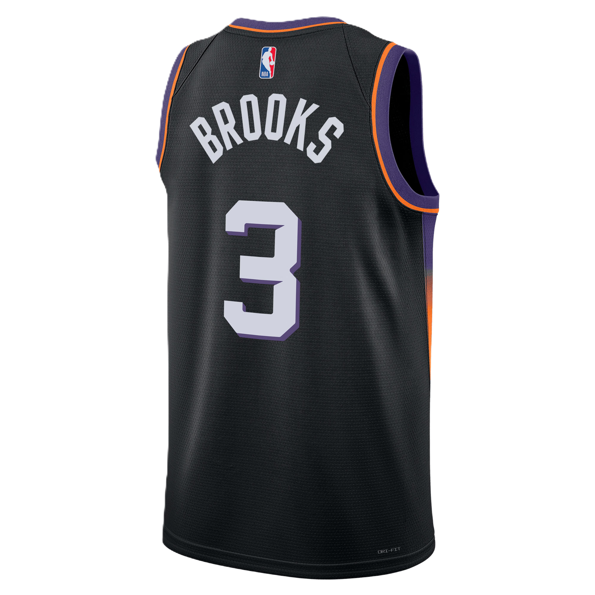 The sleek, intimidating black base sets a serious tone. The "PHOENIX" wordmark and Brooks' powerful number 3 cut through the darkness in crisp white, accented by electric purple trim. Pay attention to the side panels where a subtle, fiery gradient of purple and orange hints at the heat of the Arizona sun, blending tradition with modern edge.