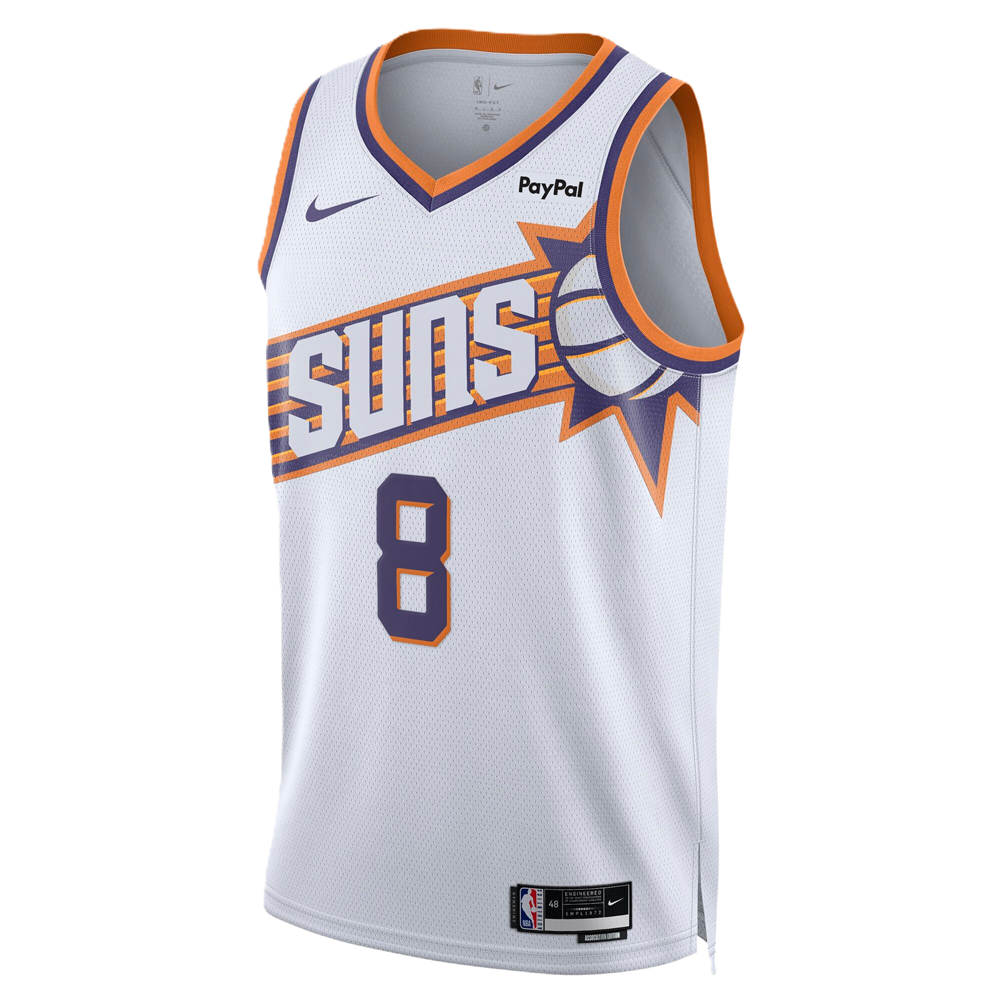 Grayson Allen's #8 Association Jersey in crisp white showcases the iconic Suns sunburst logo across the chest, with "SUNS" and the number rendered in bold purple and orange. The white ball at the center of the sunburst ties the design together, keeping it sharp and unmistakably Suns.