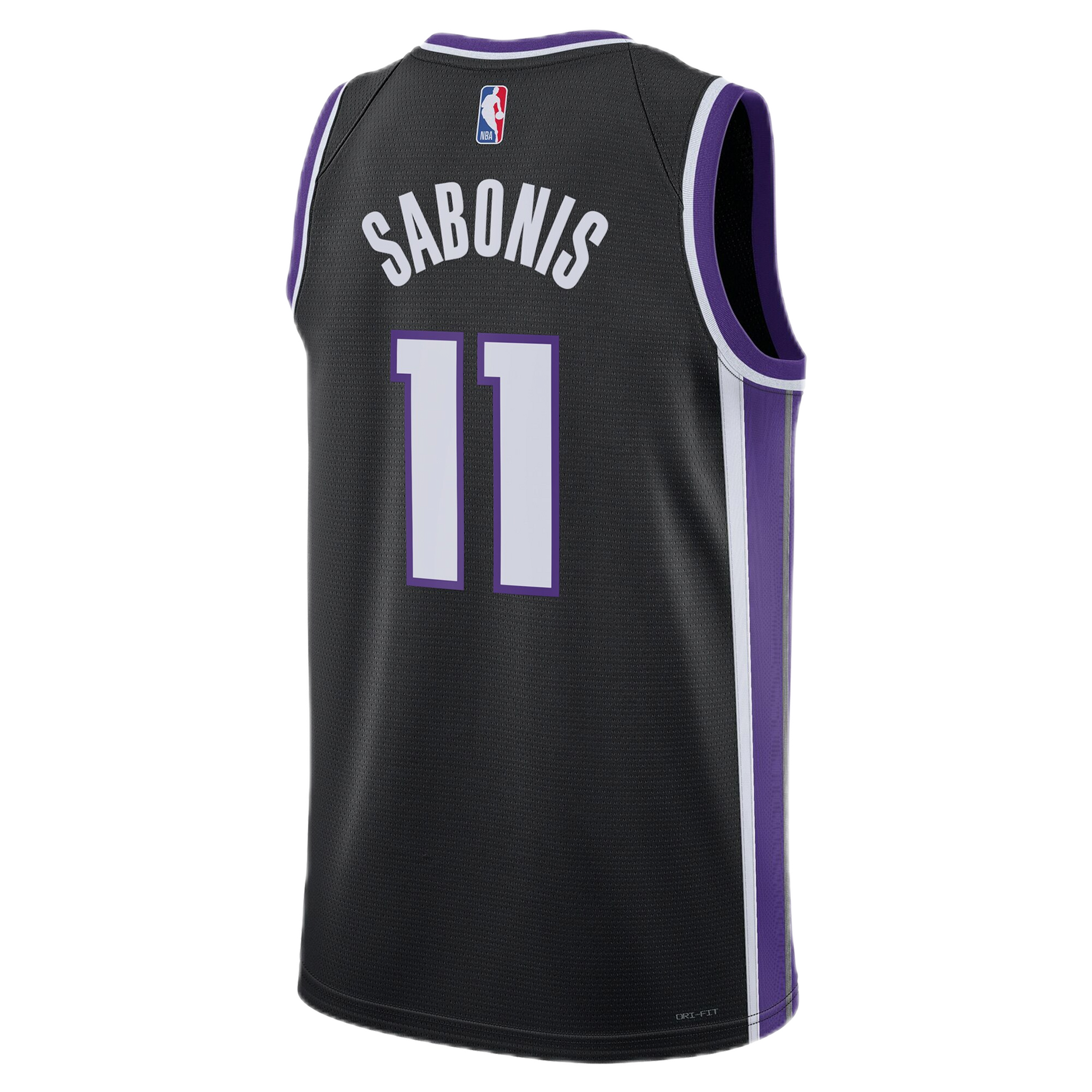 The bold black color provides a striking backdrop for the purple and white accents, highlighting the modernized script wordmark across the chest—a sharp update that honors Kings heritage. Sabonis’s #11 is prominently displayed, a number he has worn throughout his career, now cementing its iconic status in Sacramento.