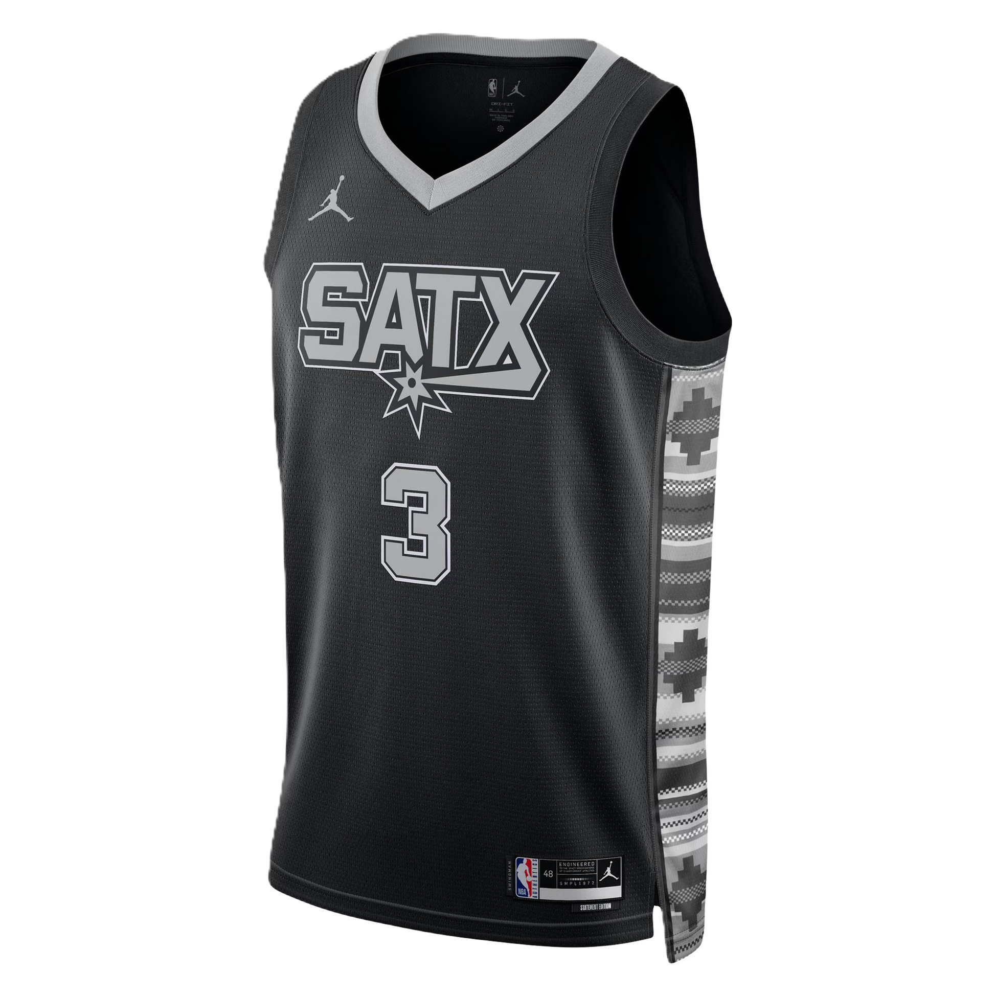 Own the court in this striking Black Statement Jersey featuring Keldon Johnson #3. The bold "SPURS" wordmark with silver accents dominates the chest, while an intricate gray and white side panel inspired by traditional Mexican serape blankets pays homage to South Texas heritage. A daring design that merges authentic team pride with cultural significance..