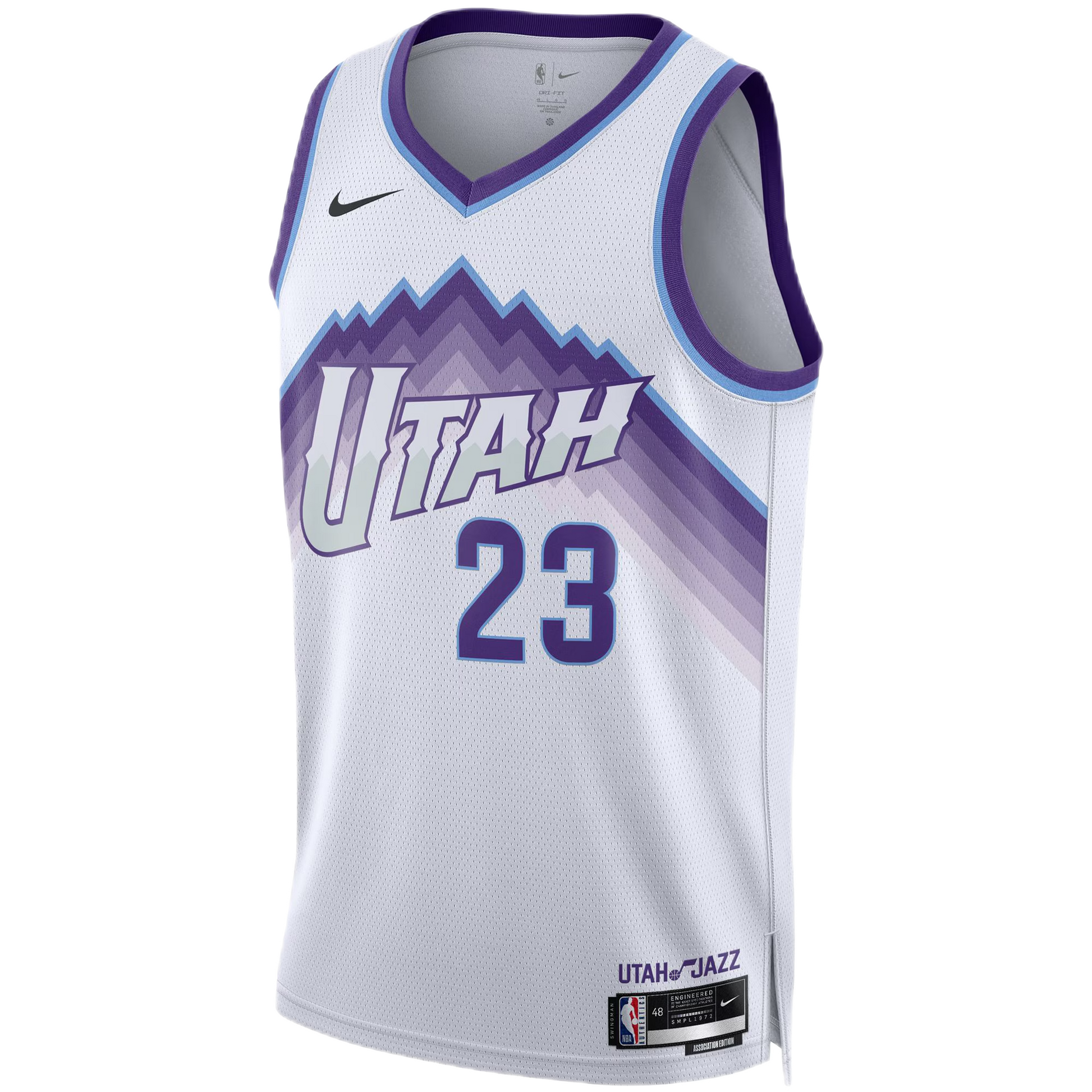 The contrasting purple and light blue striping around the collar and armholes provides a touch of flair. This uniform represents the fundamental spirit of the Jazz, the base layer of excellence that Lauri Markkanen brings to the court every night. Secure your White Association Edition today and own the uniform that embodies the core of Utah Jazz basketball!